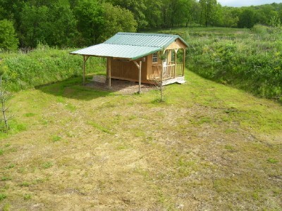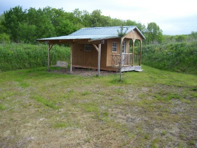This cottage has its own private hidden lot. It is a one room unit, with small loft, basic electric installed, and water to site. There is a flip down single bunk and a convertible double dinette for sleeping. It has a covered front porch, along with a covered patio area. The Cottage itself is 10 x 16, with the added Covered Patio of another 10 x 16.